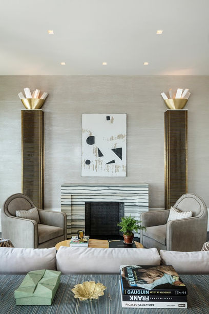 This elegant apartment high above the city features the plaster finishing talents of SuperStrata. A horizontal striated plaster finish wraps around the walls of the home’s main living space, echoing the line patterns showcased on the fireplace and the columns that flank it as a lighting source. Working in harmony with the surrounding decor, this custom tooled plaster finish acts as a subtle, textural element to enhance the room.